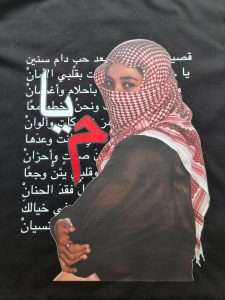 - Desain Grafis Arab: Sablon full print dengan gambar seseorang mengenakan penutup kepala Arab, dipadukan dengan teks Arab dan aksen merah.
