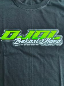 - Keunggulan Sablon DTF: Mampu mencetak desain foto kompleks dan desain teks bold dengan warna neon solid (seperti hijau stabilo pada logo OJOL) pada kaos gelap, dengan hasil cetak yang halus dan tahan lama.