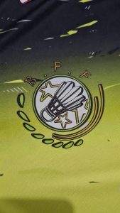 Ringkasan Proyek: Joy Cloth Sablon & Konveksi dipercaya untuk mengerjakan Sablon DTF (Digital Transfer Film) sebanyak 13 pcs jersey. Proyek ini spesifik karena pelanggan membawa sendiri jersey full-print mereka yang memiliki desain gradasi hitam-neon/lime-putih. Teknik Sablon DTF dipilih untuk mengaplikasikan logo komunitas BFF yang rumit dan berwarna, memastikan hasil cetak logo shuttlecock dan bintang di dada terlihat tajam, cerah, dan tahan lama meskipun digunakan untuk aktivitas olahraga intensif.